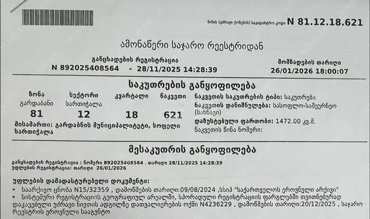 სასწრაფოდ იყიდება საკარმიდამო ნაკვეთი სოფ. სართიჭალაში. კომუნიკაციები ნაკვეთთან არის.