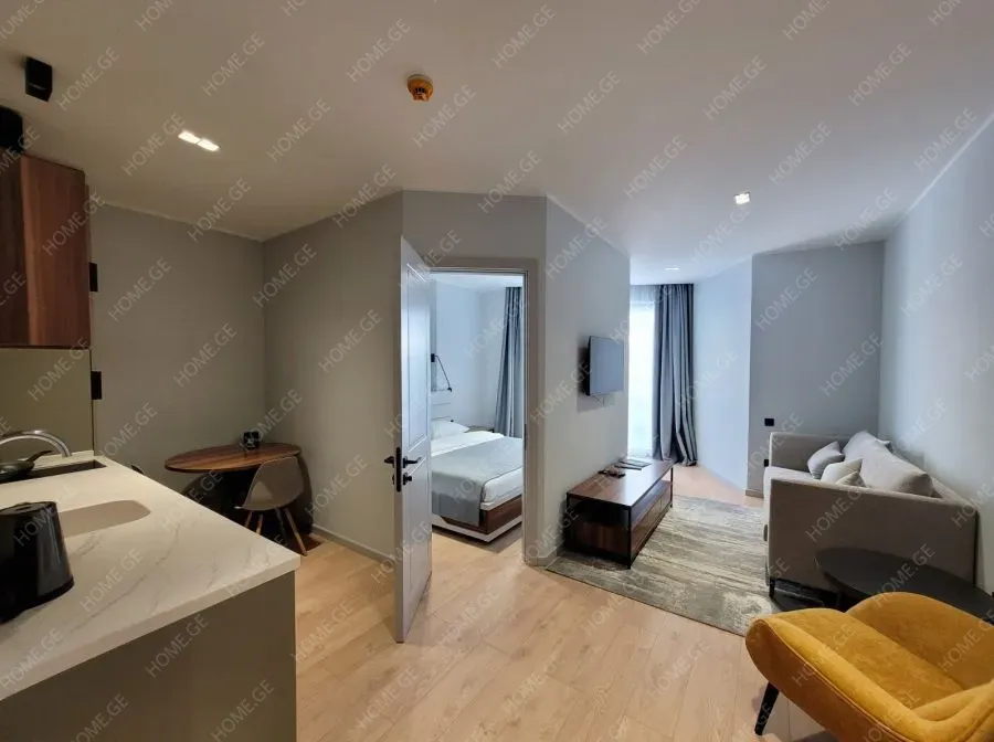 Продаётся квартира с отдельной спальней в Mziuri Gardens — с мебелью и техникой, под управлением гостиничного бренда.