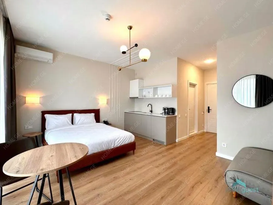 Студия полностью укомплектована мебелью и бытовой техникой, есть большая гардеробная.