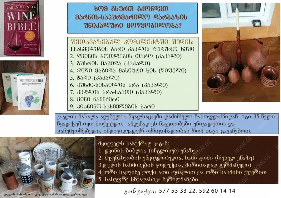 იყიდება მარნის-საპურმარილო დარბაზის ავეჯის კომპლექტი, უნიკალური, ორიგინალური, განუმეორებელი. ნაკეთობების ძირითადი ნაწილი დამზადებულია ნამეხარი კაკლის ხისგან, რომელიც ამოღებულია წყალსაცავში დაძირული ნასოფლარიდან 35 წლის შემდეგ. ანუ, როგორც მასალის ლეგენდას ანალოგი არ გააჩნია. მაქსიმალურადაა შენარჩუნებული ბუნებრივი ფორმები. ჩვენ მხოლოდ ფუნქციური დატვირთვა შევძინეთ. მყიდველისთვის საინტერესო თემატური საჩუქრებიც გვაქვს გათვალისწინებული. კომპლექტის ფასია 11 ათასი ლარი